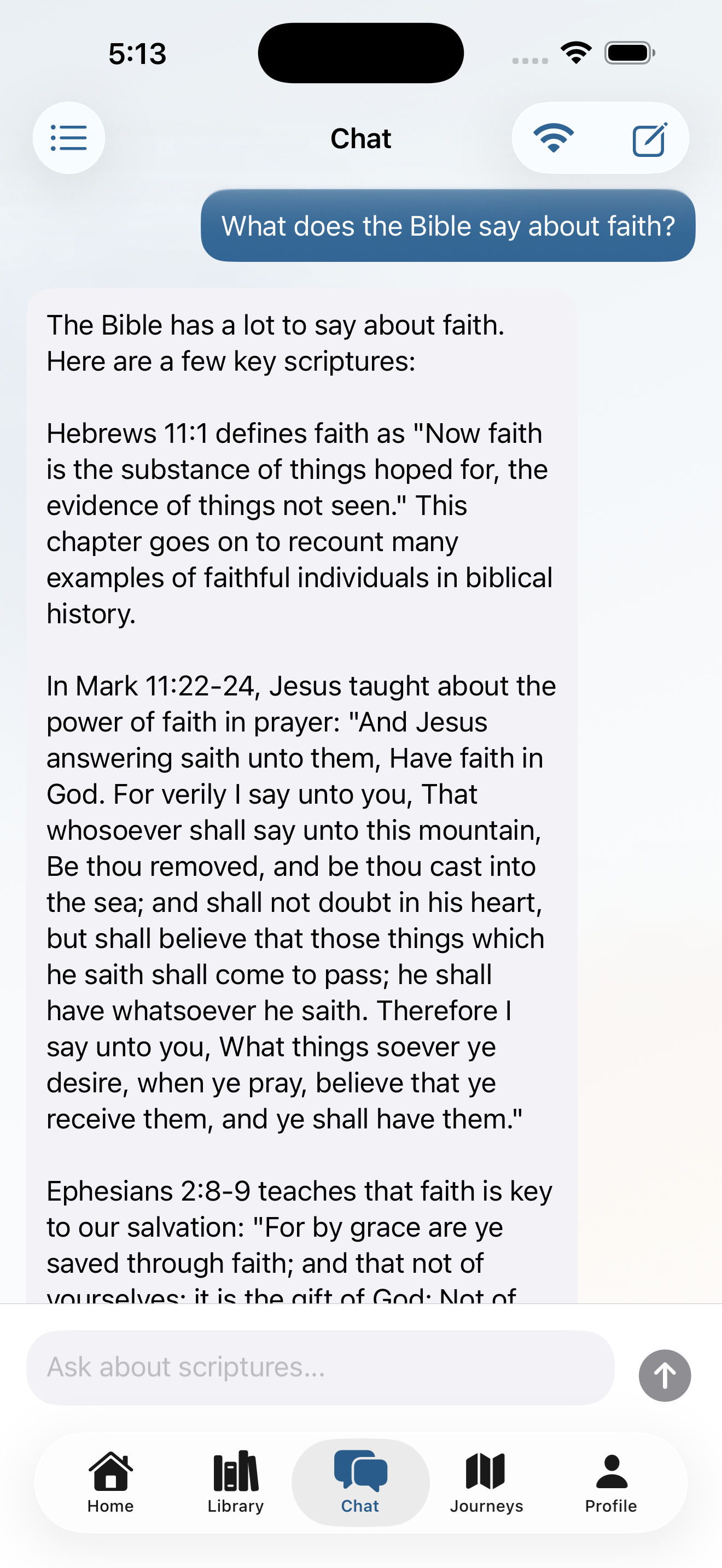 Integrated Apple Foundation Models to run the scripture-aware chat assistant entirely on-device. Questions about verses, context, and cross-references are answered instantly — no network round-trip, and nothing ever leaves the user's phone.